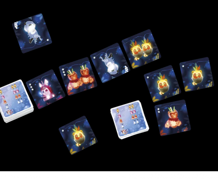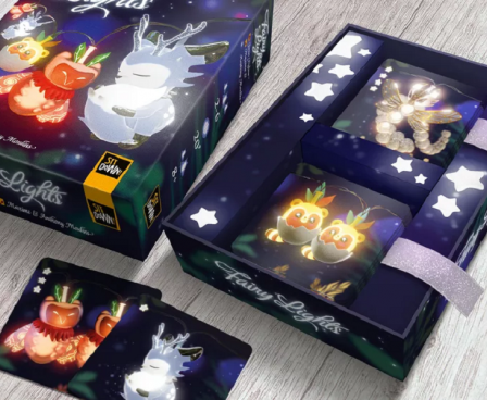 To play, shuffle the deck and place it face down. Cards in the deck show 1 or 2 bulbs in one of five colors, and each card is worth 0-2 points. At the start of your turn, see how many cards are in the "shop", the central area of play:
