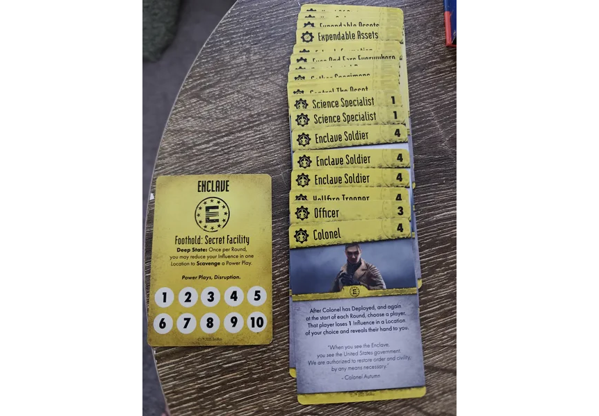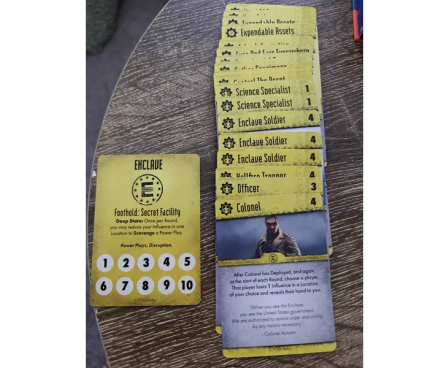 Welcome to Fallout: Power Play!, in which you control one of four factions from the Fallout universe: the Brotherhood, Raiders, the Enclave, and Super Mutant. You are all vying for control of locations within the Wasteland.