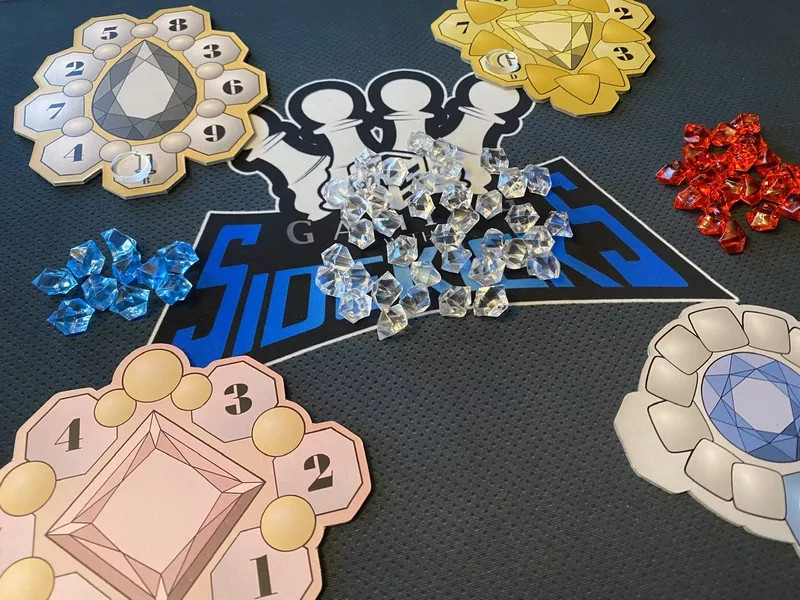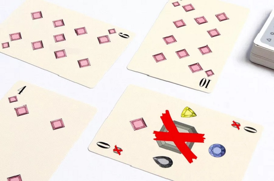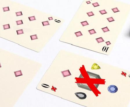 The deck in Faux Diamonds consists of sixty cards, numbered 1-13 in 4 different suits as well as 8 faux diamond cards. In each round, the players start with a hand of ten cards. Each player will select one card to keep facedown as their end of round diamond sale. One player leads a card, and everyone else must play one card, following suit if possible. As you play a card, if you cannot follow suit, you immediately get to sell a diamond in the suit you did play. The player who played the highest card in the suit that was led wins the trick, and also gets to sell a diamond.