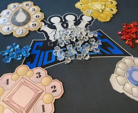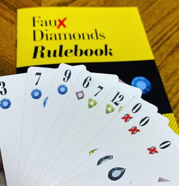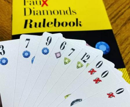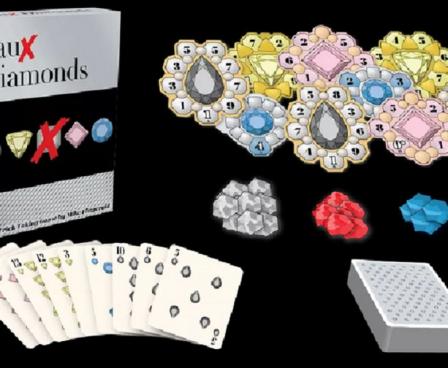 Faux Diamonds is a 4-suit trick-taking game in which players sell their cards (diamonds) on value tracks that change after each sale. After a series of hands, the winner is the player who has accumulated the most wealth.