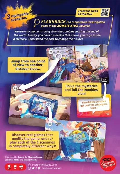 Flashback: Zombie Kidz is an investigation game using pictures. Embark on a co-operative adventure with other kids or with your whole family in a world frozen in time. Discover the whole story, bit by bit, through the eyes of the characters living it. Put together all the points of view to discover clues, uncover and figure out mysteries, and answer the final questions. Explore the past to solve mysteries in the present, and change the future to save the world from horrible monsters!