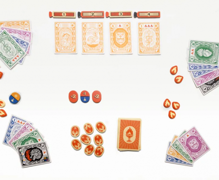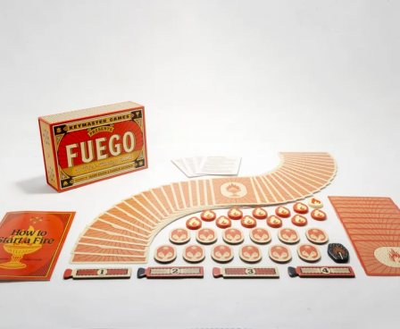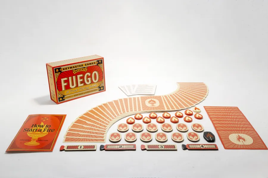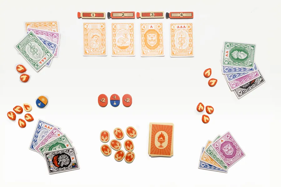 Fuego is played over a series of rounds in which you play tricks. Clever card play and well-timed strikes will win you a trick and let you take flame tokens from opponents. Extinguish your opponent by taking all of their flame tokens or have the most flame tokens at the end of the round to win. The first player or team to win two rounds wins the game!