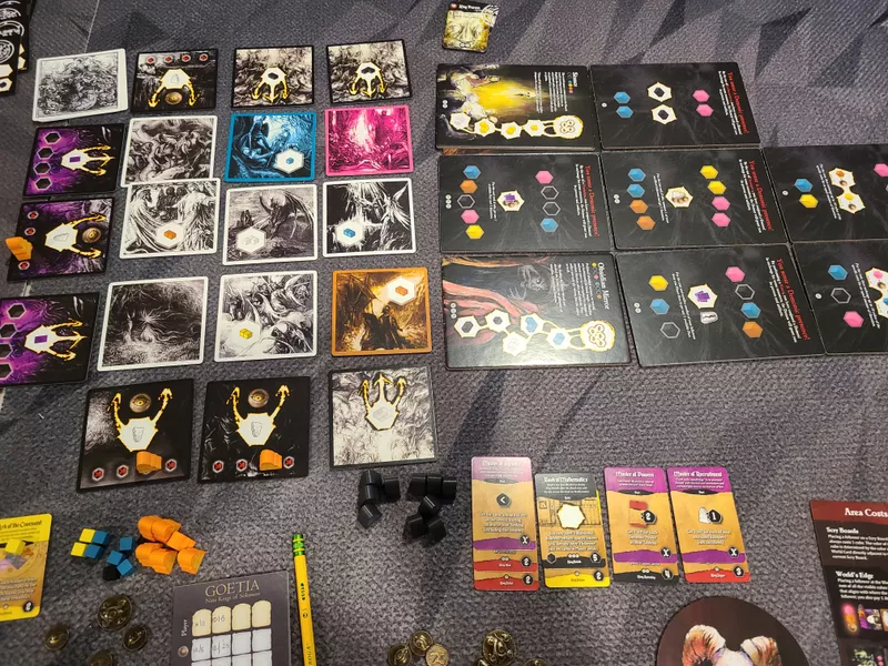 Goetia: Nine Kings of Solomon is a worker placement, resource management game where each players try to contact, conjure and worship goetic demons. The game is focusing on the 9 demon kings that appear in the scriptures Lemegeton Clavicula Salomonis.