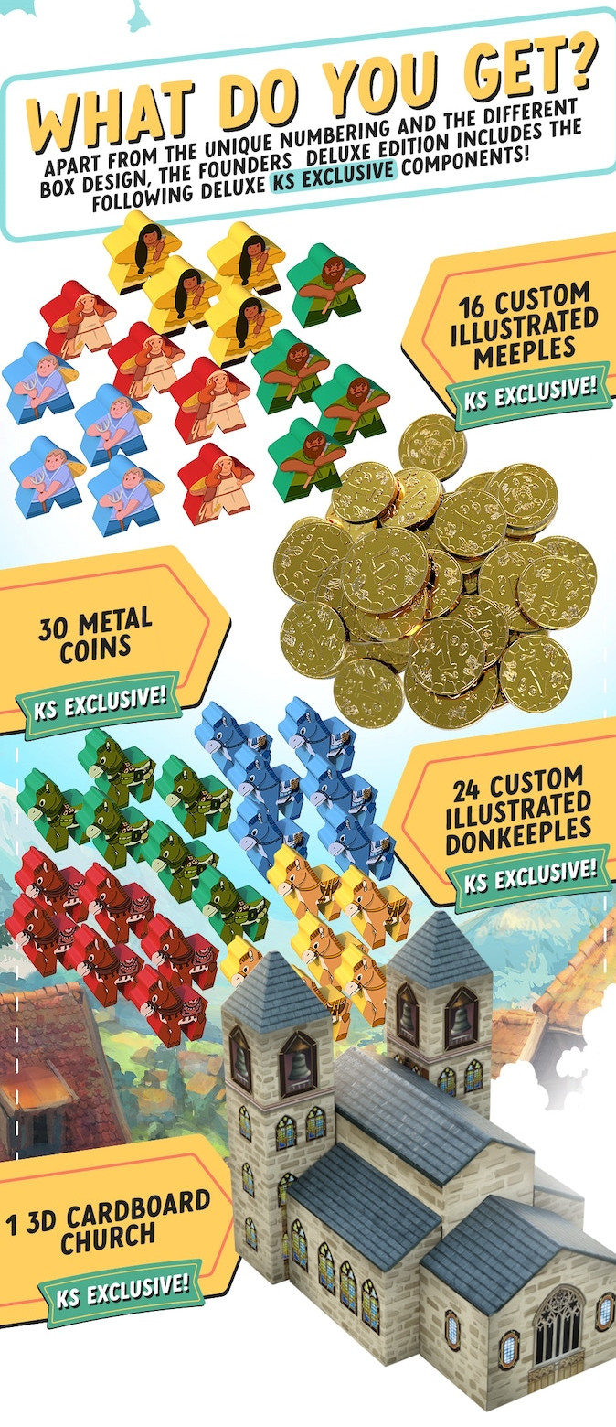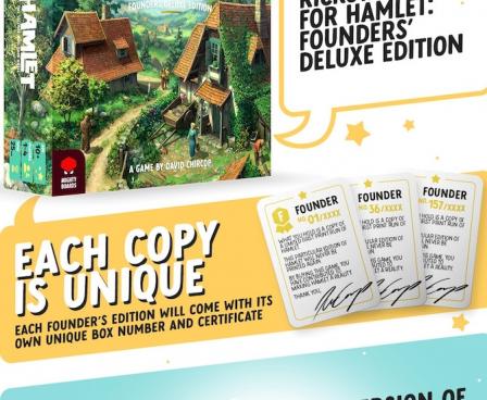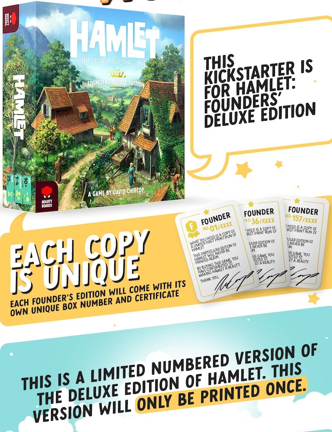 Hamlet is a medium weight competitive village builder where players are communally turning their Hamlet into a bustling little town. In this tile placing game, players construct buildings that everyone can use to create materials, refine resources, earn money and make important deliveries to construct the Hamlet’s big landmark - the Church.