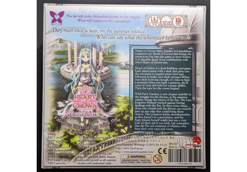 Heart of Crown: Fairy Garden is a standalone expansion for Heart of Crown that contains all the cards from the base game to play on its own, and may be integrated with the cards of the base game and the other Heart of Crown expansions.
