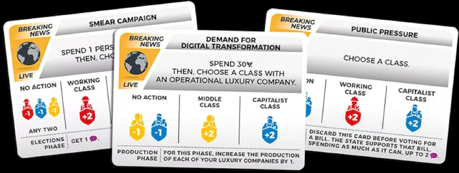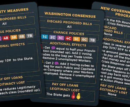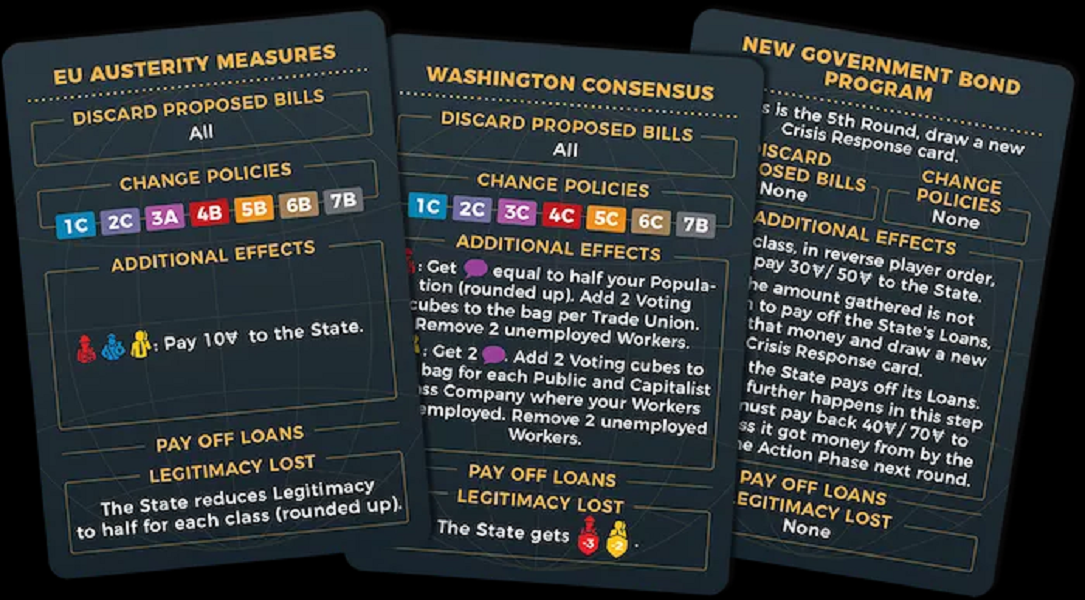 Crisis & Control offers new challenges and additional game modes that will test your governance skills like never before! Crisis Response cards and Alternative Events add more diversity to your games, class-specific Hidden Agendas incentivize new politico-economic strategies, and the Automas provided allow you to experience all of the game’s roles, no matter the player count!