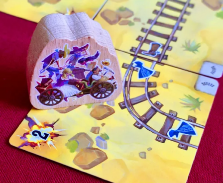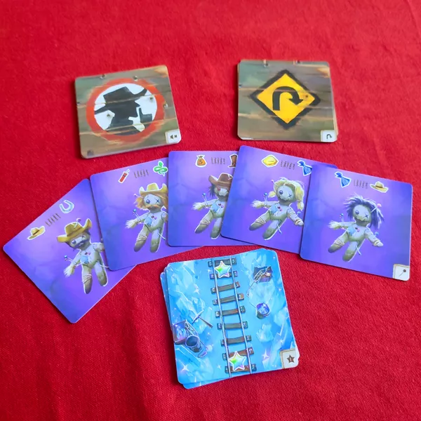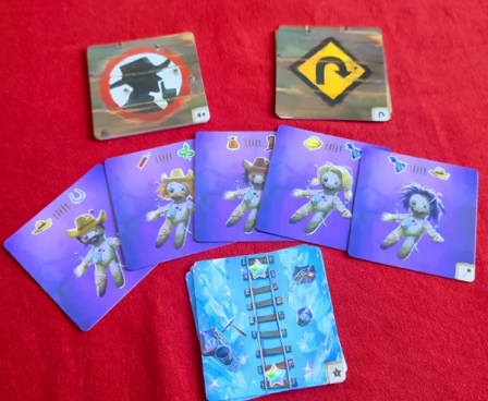 At the start of the game, place the 3 starting cards and the wagon on the last one. There is no turn order: when the time is right, the player with the best card plays and activates its effect. They draw a card and any other player can take a turn (in the 2 players variant, you can play 2 cards consecutively). Once a card is played, move the wagon onto it. Place the exit card in the 7 minutes time span to win the game!