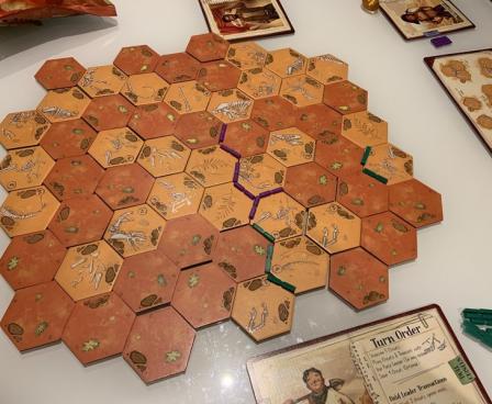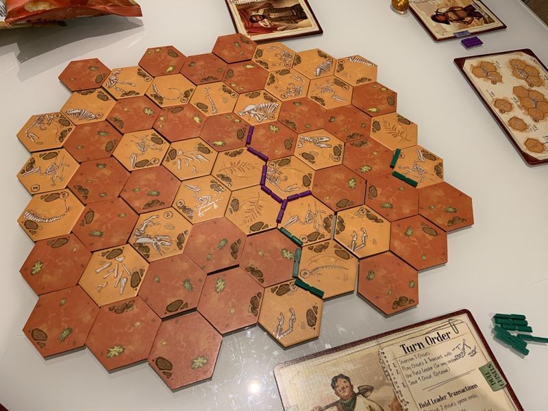 Players will take turns placing their sharpened chisels onto lines around the hex tiles, which are laid out in a single slab. Once a section of the slab is broken off from the rest of the rock hex tiles, it is divided up among the players who helped contribute to the break. Broken off tiles are assembled by the players who collected them into various dinosaur fossils, with varying point values. Once all of the tiles have been collected by players, the totals of all the completed fossils are tallied up with the highest score winning!