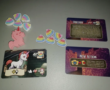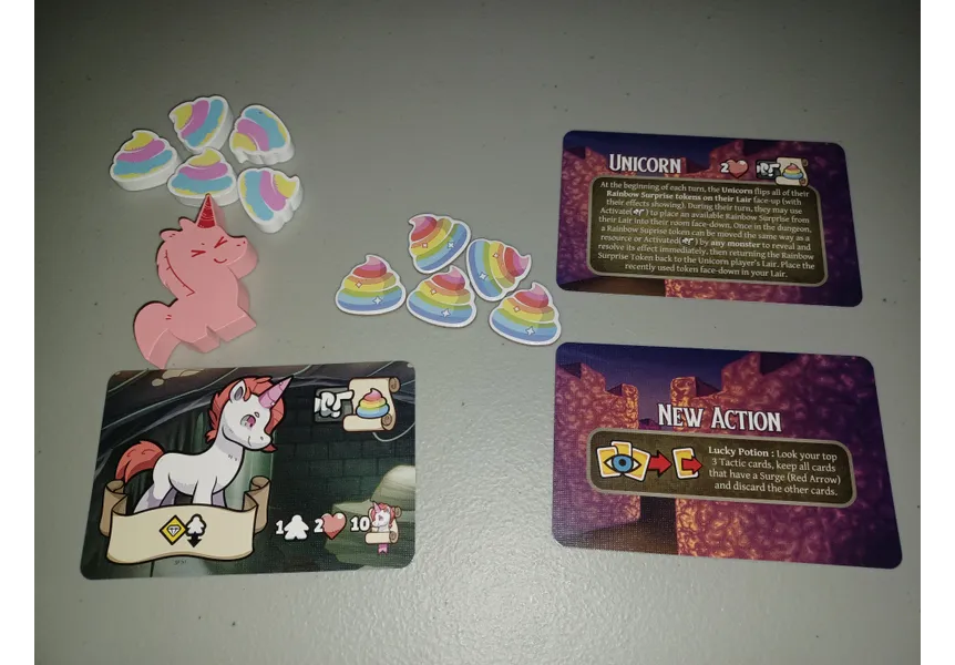 This crowdfunding exclusive expansion adds a unicorn as a playable monster clan. The unicorn can drop rainbow-surprises all around the dungeon, providing magical boots to their monster friends.