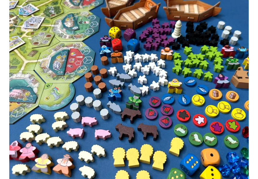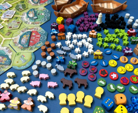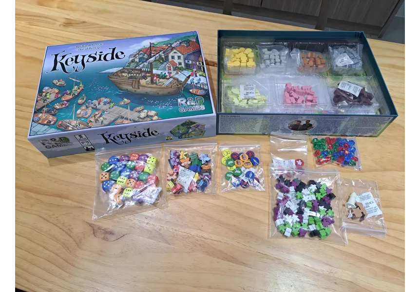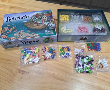 Each player controls a team of 18 workers, known as ‘keyples’, who will work in the farms, harbours, markets, quarry, wheat field and woods. Players use their 6 dice to either direct the boats to their chosen harbours or to join the other players on their turns and, in both cases, set their team of keyples to work.