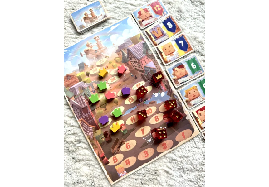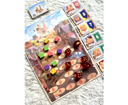 Players roll dice to achieve a valid result. If they succeed, they will place one of their markers on the board. At the end of each round, based on the positions of their markers, players will encounter kingdom inhabitants who grant points. At the end of the third round, the player with the most points wins the game.
