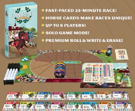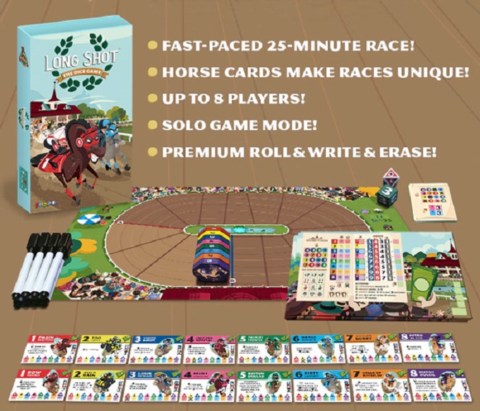 In Long Shot: The Dice Game, you and up to seven other players will strategize and push your luck as the action unfolds in a tense race of eight horses. During the game you buy horses, place bets, influence race movement, and utilize special abilities. The roll of the dice determines which horses move and the options available each turn, so be ready to adapt your plans. Once three horses cross the finish line, earnings are totaled. While there are many ways to earn money during a horse race, only the player that makes the most money will be declared the winner. Will you play it safe, or risk it big on a long shot?