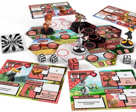 Looney Tunes Mayhem is built around the "Mayhem System", a system for character vs. character team-based combat in which the most direct method for a team to gain VP is by KOing their opponents. Characters use items and powers to battle the enemy team, with battle damage changing each round based on the mayhem die. When a character is KOed, they are removed from the board and their opponent gains VPs, with the KOed character returning to play next round.