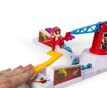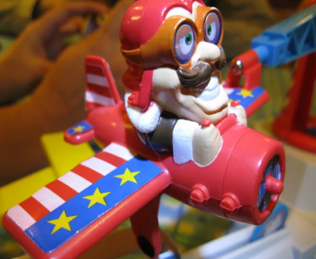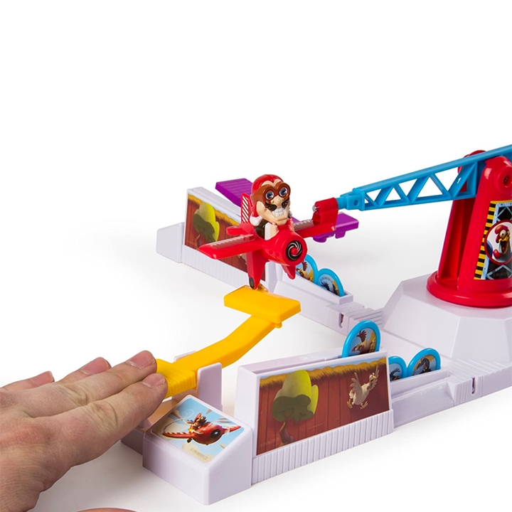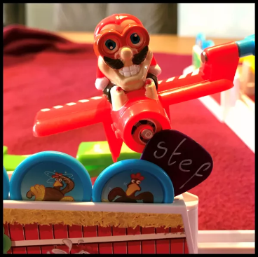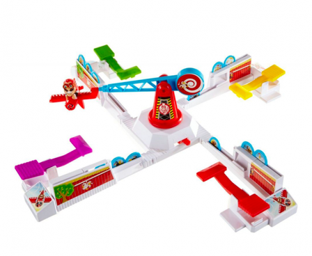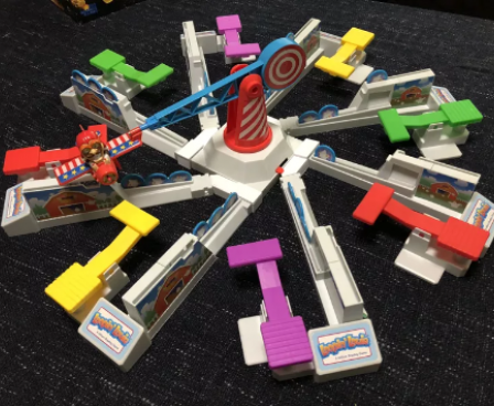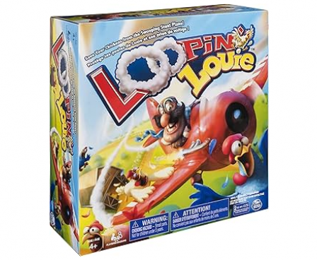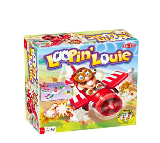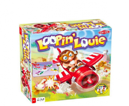 In Loopin' Louie, a battery-powered motor placed in the center of the table rotates a boom with a little plastic plane. Four radial arms lead out to the players' barns and the chickens they're trying to protect. Each barn has a little lever, which is used to knock the rotating plane away from your chickens and hopefully into someone else's. When only one player has chickens remaining, he or she wins the game. Very silly and very addictive.