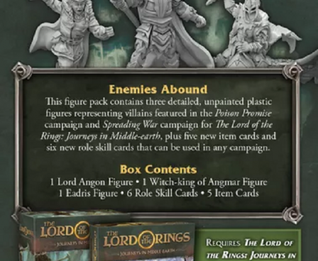 The Scourges of the Wastes Figure Pack for The Lord of the Rings: Journeys in Middle-earth can enhance both the Spreading War campaign and the Poison Promise downloadable campaign. This pack contains three beautifully-sculpted new miniatures of the primary villains of the two campaigns, as well as five new item cards and a new role that can be used in any Journeys in Middle-earth adventure. No collection would be complete without it!
