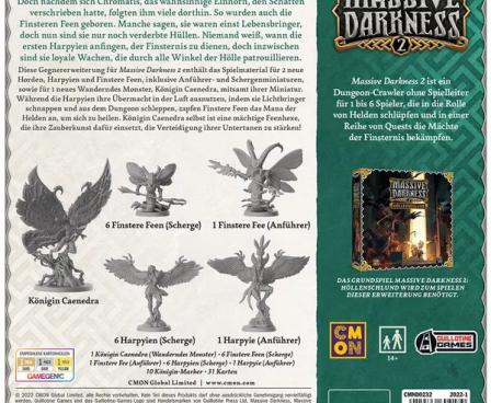 1–6 Players This expansions for Massive Darkness 2: Hellscape brings you 2 new Mobs (Dark Pixies and Harpies) with their Minions and Leaders but also a terrifying Roaming Monster: Queen Caenedra!