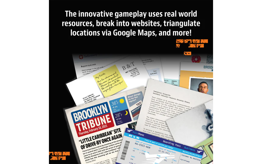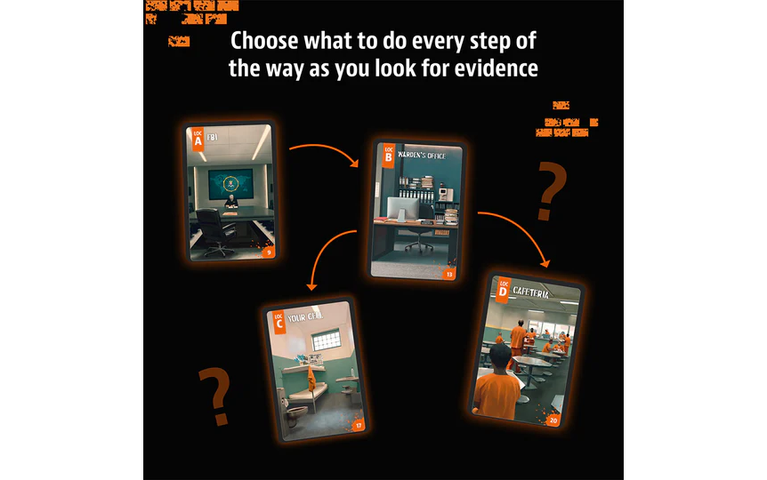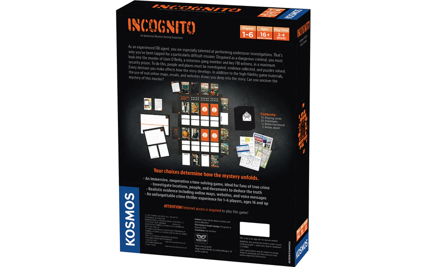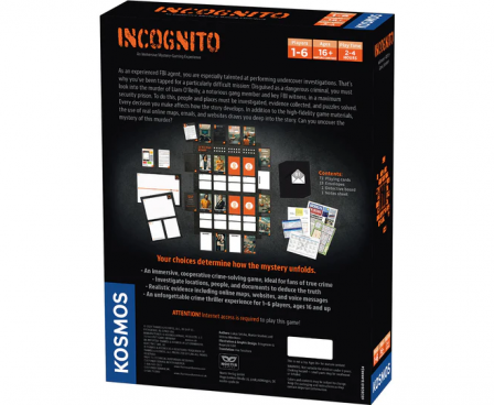 In more detail, Incognito is a co-operative deductive murder mystery game in which players must solve puzzles, follow clues, and make decisions to solve a case. They do this using the included deck of cards, twelve hidden realistic clue documents, and the Internet. Through a choose-your-own-adventure mechanism, players make decisions that influence the course of the game and lead to solving the case in the end. One by one, they enter different realistically-designed locations and encounter the various suspects, then they choose from three different ways to deal with the situation and receive points based on their decisions. Complex puzzles and escape room elements must be solved in order to progress further in the case.