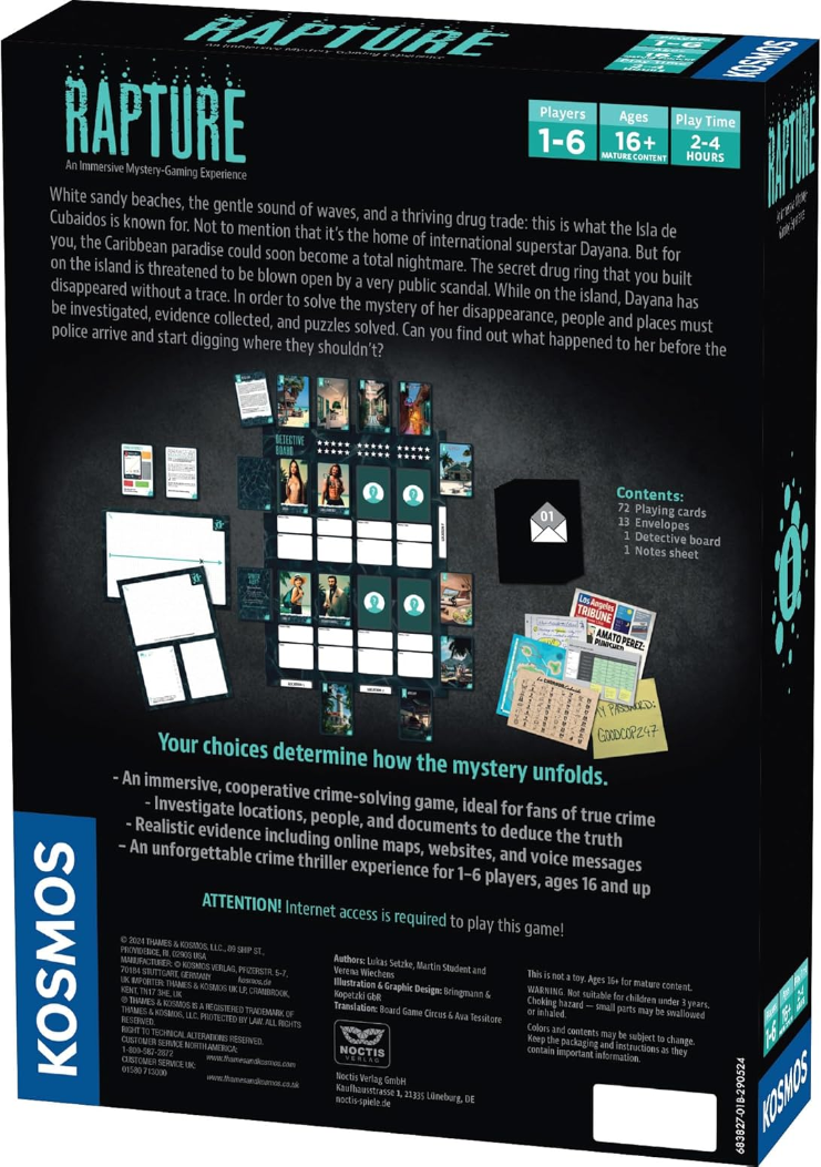 Masters of Crime: Rapture is a co-operative deductive murder mystery game in which players must solve puzzles, follow clues and make decisions to solve a case. They do this using the included deck of cards, twelve hidden realistic clue documents, and the Internet. Through a choose-your-own-adventure mechanism, players make decisions that influence the course of the game and lead to solving the case in the end. One by one, they enter different realistically designed locations and encounter the various suspects. Then they choose from three different ways to deal with the situation and receive points based on their decisions. Complex puzzles and escape room elements must be solved in order to progress further in the case.