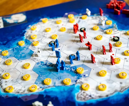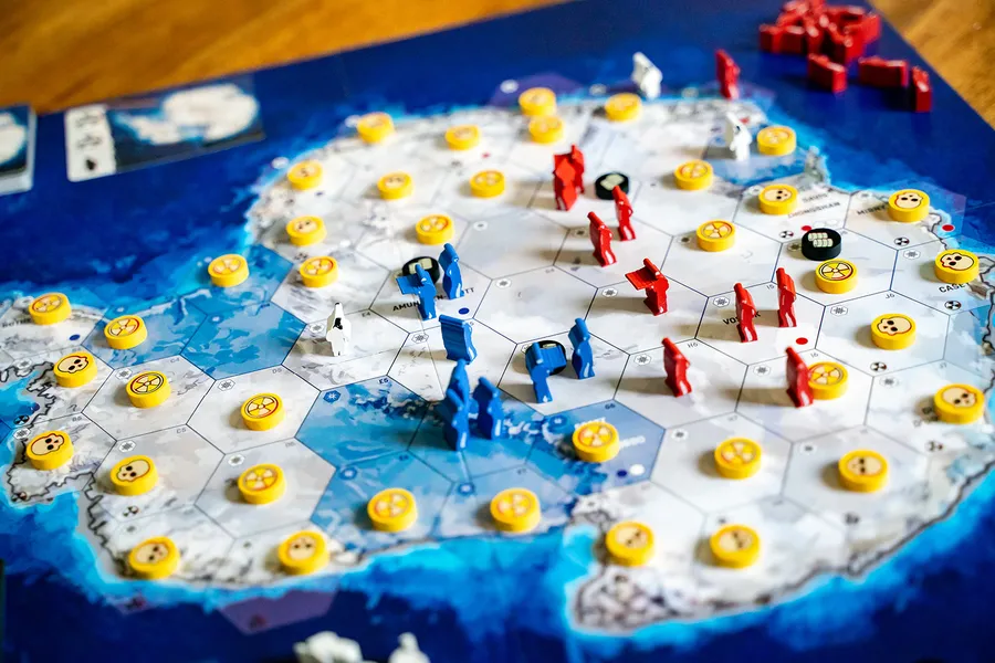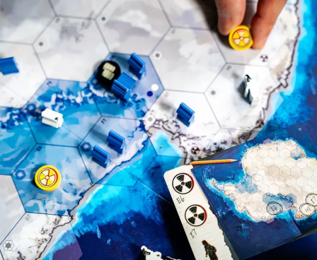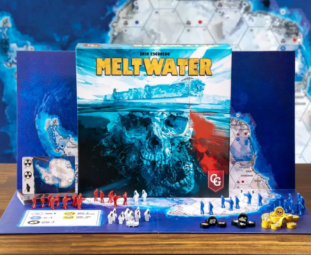 In Meltwater, two players take command of the shattered remains of the superpowers, struggling for control of the ice. Simple diceless mechanics let players displace, corner, and isolate their opponent’s survivors. Here, hunger is a crueler weapon than gunfire, and the barren tundra can only support so many souls. And every turn, radioactive contamination pushes in from the coastline, shrinking the available space and forcing the belligerents closer and closer together.