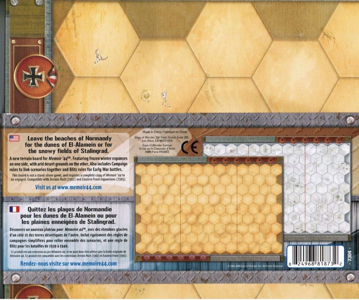 The Memoir '44: Winter/Desert Board Map is a new double-sided Battlefield board for Memoir '44 that features frozen expanses on one side and desert ones on the other. It also includes a simple set of Campaign rules to link scenarios together and Blitz rules for Early War conflict.