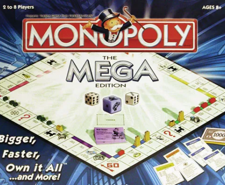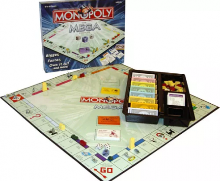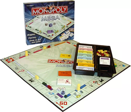 Monopoly: The Mega Edition is bigger and believe it or not, faster than regular Monopoly. What makes it bigger is a larger board, Train Depots, Skyscrapers, 9 new Properties, and the addition of the $1,000 bill. It is faster because of a new speed die and Bus cards. Monopoly: The Mega Edition can be played in 1½ hours with more fun than ever!