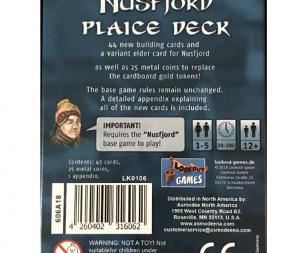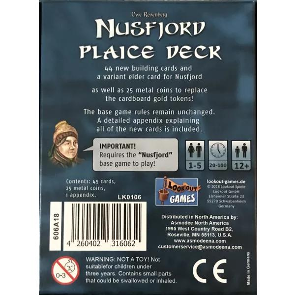 EXPANSION FOR: NUSFJORD Board Game Nusfjord: Plaice Deck contains 45 new cards for use with the Nusfjord base game. Also comes with metal coins, most useful to replace the coins from the first edition that were printed too small.