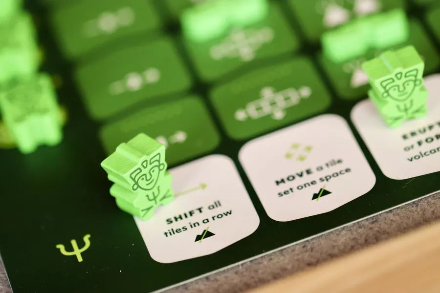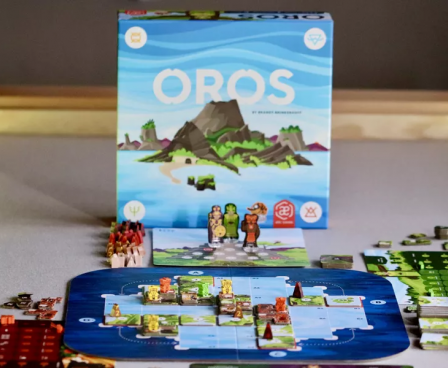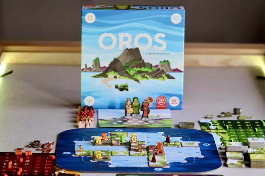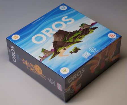 Oros is a tile-colliding, volcano erupting, mountain-making, wisdom-gathering, action-economy strategy game. On individual player mats, players move their Followers between action spaces, allowing them to manipulate a shared environment like a giant puzzle of plate tectonics. Action spaces allow players to shift rows of land, move and collide land tiles, form and erupt volcanoes, worship to gain wisdom, journey their Followers around the ever-shifting landscape, and build sacred places of study and worship on mountains. Building sacred places and worshipping in sacred places brings wisdom which is used to improve the abilities available for each action space. Wisdom is also used to improve the end game value of each sacred place built as well as reach other goals worth end game points.