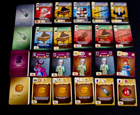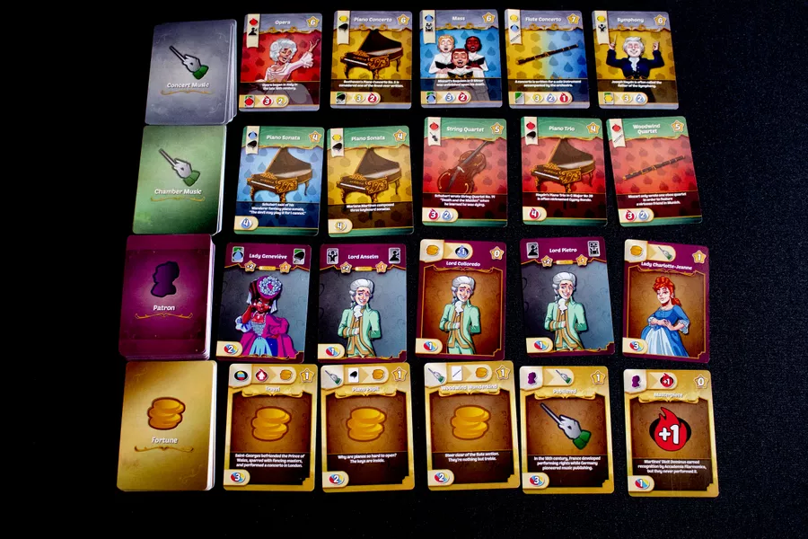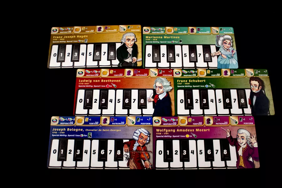 Each turn, players choose one of four actions: Seek Inspiration, Seek Fortune, Seek Patronage, or Perform. Inspiration is your primary resource and it comes in three tones - Joy, Passion and Sorrow. Seeking inspiration allows you to gain your resource while all of the other actions will have players spend inspiration to acquire cards. Fortune cards help build your engine, which can allow you to gain bonus actions on your turn. Patron cards can also help build your engine or can give you bonus legacy points for end game scoring. Chamber Music and Concert Music cards give you lots of legacy points, but every time you perform, your opponents can attend your performance and gain inspiration. You will not only have a special ability as your specific composer, but you are also the only person who can compose your very own Magnum Opus. Complete specific goals to gain Maestro cards and end the game.