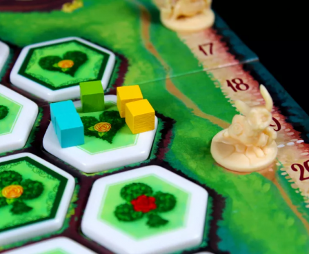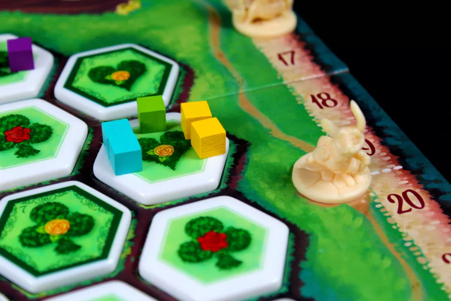 Every turn, together as a team you must guess at least one of these secret whim cards. You can't say what your card shows, but by carefully placing a new shrub tile into the garden (taken from those available in the Greenhouse) you are able to reveal clues, tokens that will show any matches between the arrangement in the garden and the secret whims each player holds in their hands.