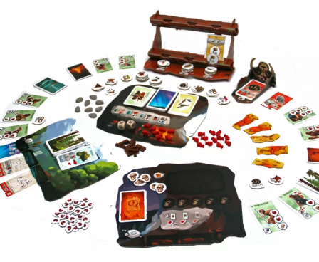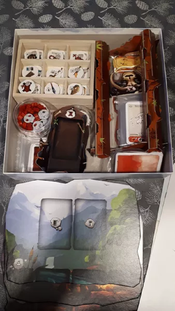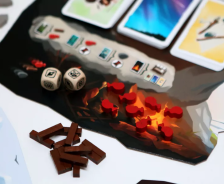 Each player starts the game with a couple of humans, who each have a skill and a number of life points. On a turn, each player chooses to go to one location — possibly of the same type as other players, although not the same location — and while you have some idea of what you might find there, you won't know for sure until you arrive, at which point you might acquire food or resources, or find what you need to craft a useful object, or discover that you can aide someone else in their project, or suffer a snakebite that brings you close to death. Life is full of both wonders and terrors...