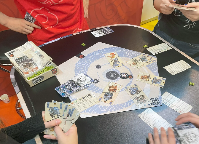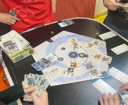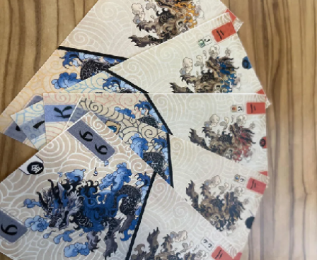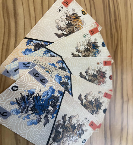 When you pass, if you've played cards and all of those cards have orange animals at the top, flip the cards so that the blue animals are at top. Each time you flip a card, you change its value depending on its suit: e.g., the water 4 becomes a pair of Qs, the wood 6 becomes a A+bamboo (and each time you play a card with bamboo, you take a bamboo token from the reserve), the earth 8 becomes a Q+panda (with you stealing a bamboo from an opponent for each panda you play), the fire 3 becomes a 10+fire, with the fire being a value of your choice when played.