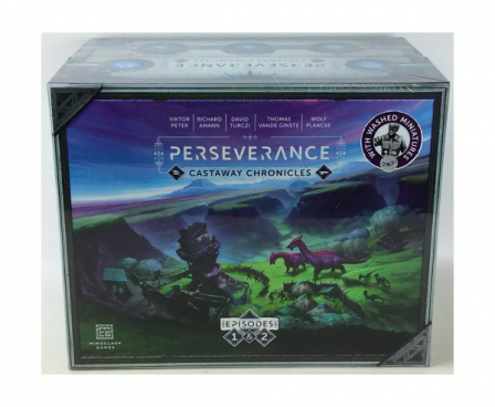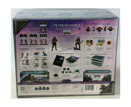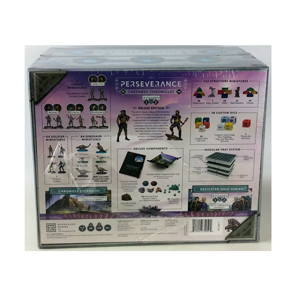 Caught in an otherworldly storm, the luxury ocean liner you were traveling on ran aground on a dinosaur island, losing all contact with the world you knew. Instead of your dream vacation, it now falls upon you and your rival aspiring leaders to forge the ragged, disorganized survivors into a functioning society. Your first task is to establish and defend a foothold settlement from the dinosaurs, but your curiosity will soon call you to adventure beyond the safety of the town walls.Over the years, your city and society will grow strong, slowly adapting to the island and learning to both fear and respect the dinosaurs inhabiting it. Your new home is a land of danger and mystery, but also beauty and opportunity. Perseverance: Castaway Chronicles consists of Episodes 1 and 2, two standalone competitive strategy games for 1-4 players, from the designers of Anachrony, Trickerion, and Yedo. Both games are playable on their own, or can be combined to experience a highly replayable Chronicle mode with overarching mechanics and no legacy elements.This Deluxe Edition includes washed miniatures and also includes the following:Episode 1 Standalone GameEpisode 2 Standalone GameChronicle ModeSolo ModeStructure MiniaturesLeader Miniatures64 Dinosaur Miniatures20 Metal Tracker Tokens30 Squishy Berry ResourcesModular Tray SystemChronicle & Art Book