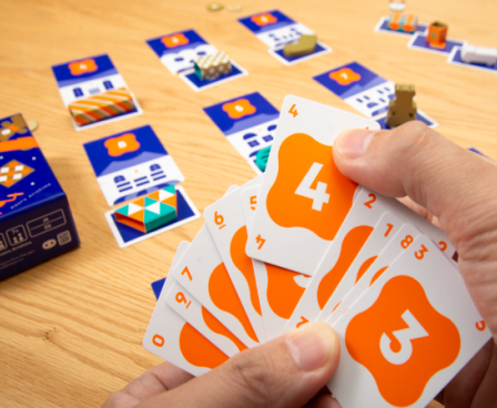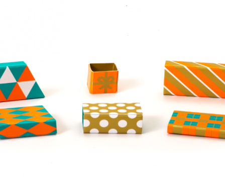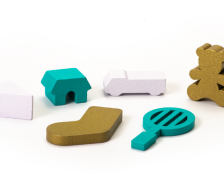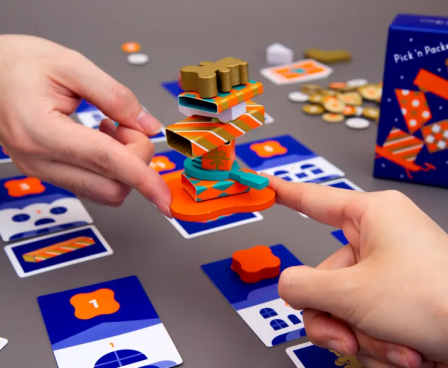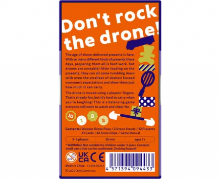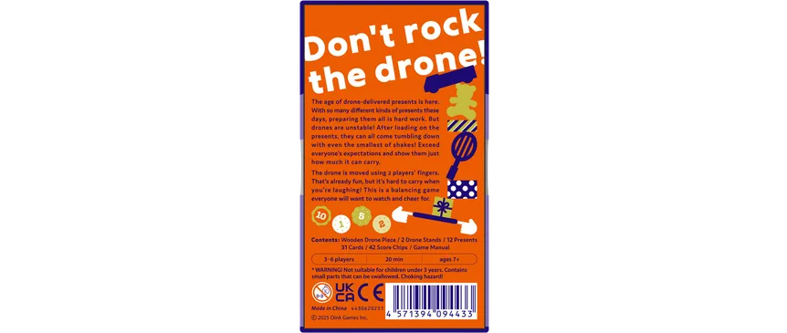 Pick 'n Packers is a balance game where two players work together to carry a drone stacked with presents. Each player uses only one finger to pinch and lift a wooden drone piece. Even the slightest difference in finger pressure causes the drone, and the presents on top, to shake, sparking excitement at the table!