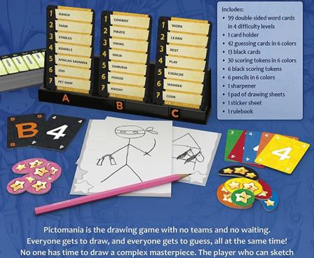 Pictomania is a drawing game in which everyone is both drawing and guessing at the same time, giving a chance for those who excel only at one or the other skill to crush the dreams of other players.