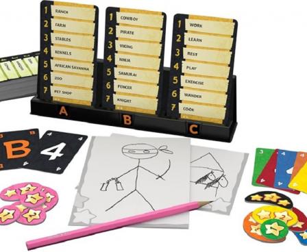 Pictomania lasts five rounds, and at the start of each round, you set up six randomly drawn cards on card racks visible to all players. Cards are double-sided, come in four levels of difficulty, and include seven related words on a single side. In addition to a set of guessing cards, scoring tokens, marker and drawing board, each player receives one symbol card and one number card, which together indicate which word or phrase on the revealed cards that player must draw. Bonus tokens equal to one less than the number of players are placed in the center of the table.