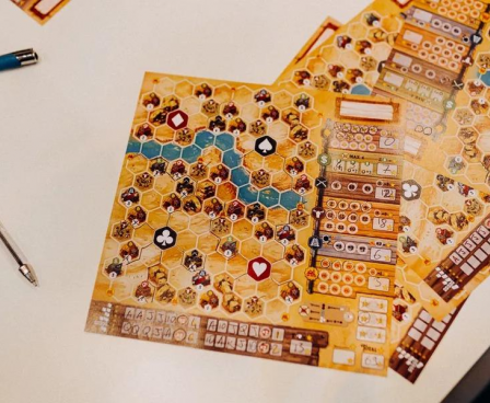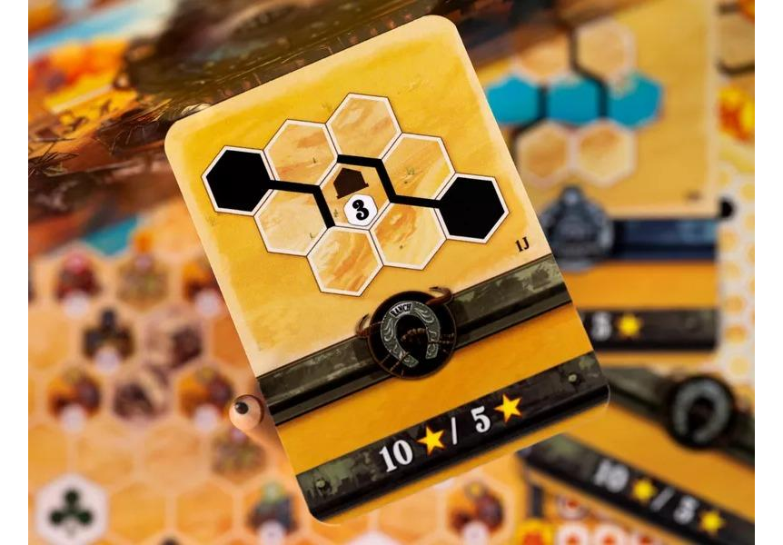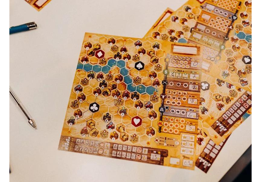 In this flip-and-write game, you use poker cards to extend your railway tracks and build a poker hand at the same time. Each turn, you choose one of the revealed poker cards. The suit of the card helps you extend your railway, connecting you to new towns and surrounding features. When you connect to a town, you gain the ability to do a one-time bonus. When you surround a feature with your tracks, you activate it for endgame scoring. The value of the card is added to your poker hand, for which you'll score additional points at the end of the round.