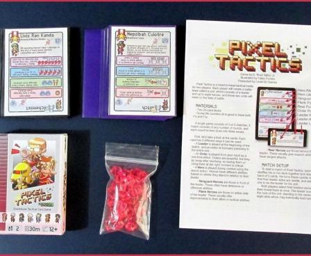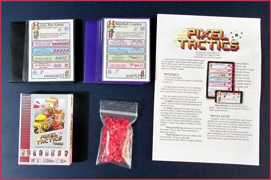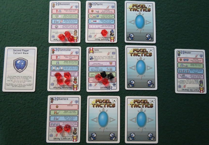 Pixel Tactics is a head-to-head game of tactical combat for two players. Each player has an identical deck of 25 cards, from which they draft a leader. The leader's abilities alter vastly the strategy and playability of every other card in the deck, making the game playable in 25 different ways.