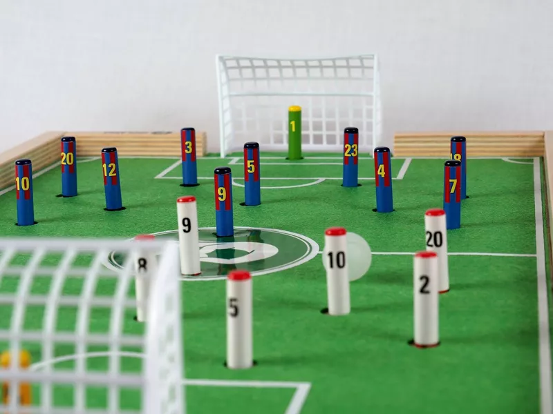Rules: Each opponent has 11 players in his/her half-field. One of both start shooting from the white mark of his/her area. From that moment each opponent has a shot from where the ball stopped. When you score a goal, the opponent must remove one of his/her 11 players. Whoever gets eliminate 11 players from the opponent WIN!