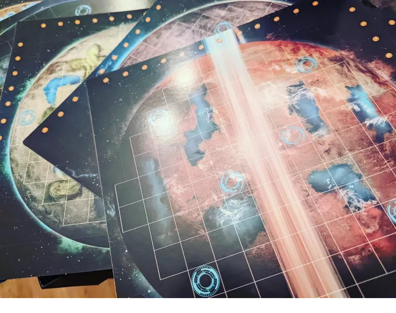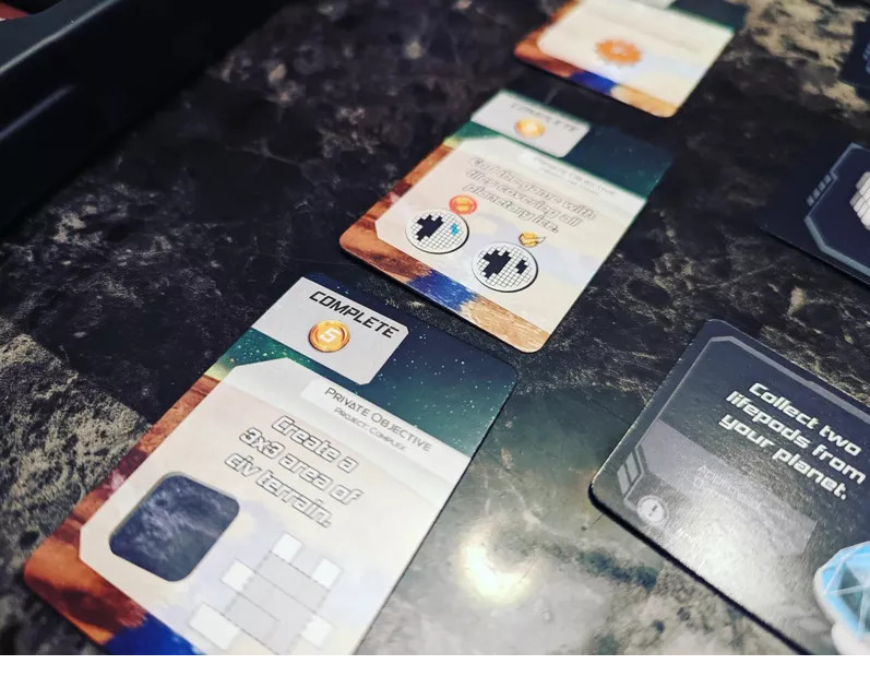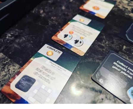 Planet Unknown is a competitive game for 1-6 players in which players attempt to develop the best planet. Each round, each player places one polyomino-shaped, dual-resource tile on their planet. Each resource represents the infrastructure needed to support life on the planet. Every tile placement is important to cover your planet efficiently and also to build up your planet's engine. After placing the tile, players do two actions associated with the two infrastructure types on the tile. Some tile placements trigger "meteors" that make all planets harder to develop and prevent them from scoring points in the meteor's row and column.