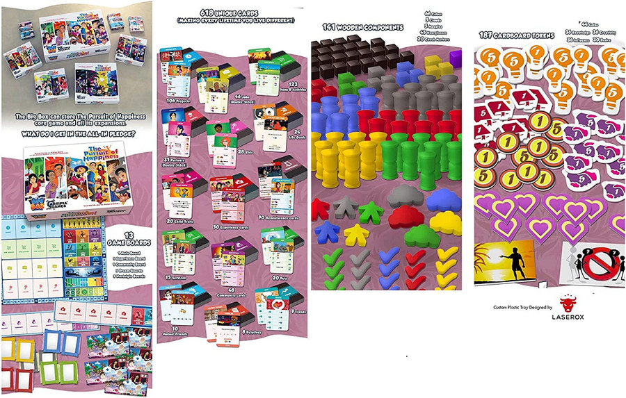The Pursuit of Happiness: Big Box is a storage option for all The Pursuit of Happiness material released to date. Inside The Pursuit of Happiness: Big Box you can easily fit all material of The Pursuit of Happiness core game, The Pursuit of Happiness: Community expansion, The Pursuit of Happiness: Experiences expansion, The Pursuit of Happiness: Nostalgia expansion and all mini expansions including KS1, KS2, KS3 and KS4 Promo Packs, Thug Life, Out of this World and more. The Big Box also fits all standard or deluxe components of the game.The Pursuit of Happiness: Big Box includes a 2-level plastic custom tray and a consolidated rulebook for all The Pursuit of Happiness material.