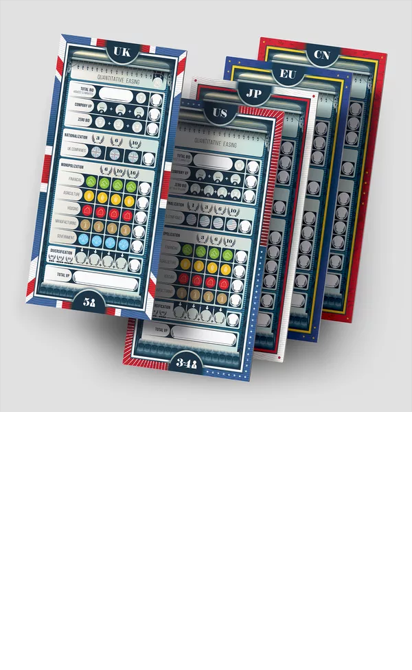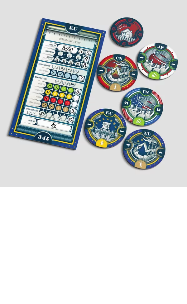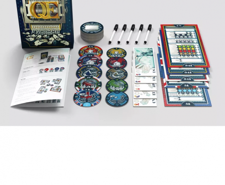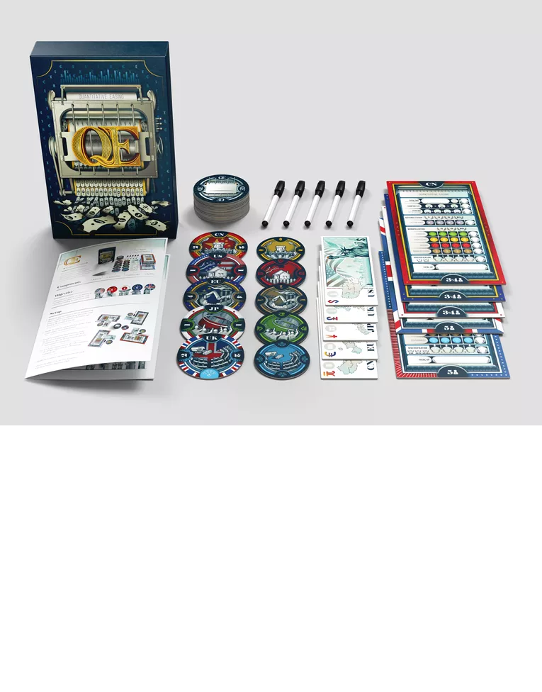 In Q.E., a term that stands for "quantitative easing", you play the role of a central bank. You bid on different size companies to accumulate various levels of victory points. The amount you bid is unlimited since you are the central bank and you own the printing press! After the initial "open" bid by the lead player, the other players bid in secret. After the sixteen companies have been "bailed out", bonus victory points are awarded for company sets of nationalization, monopolization, and diversification.