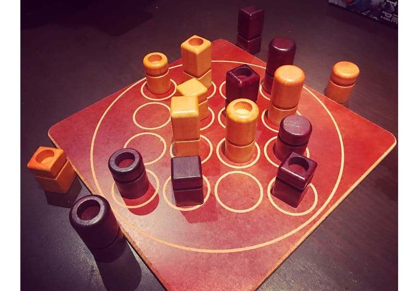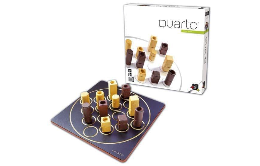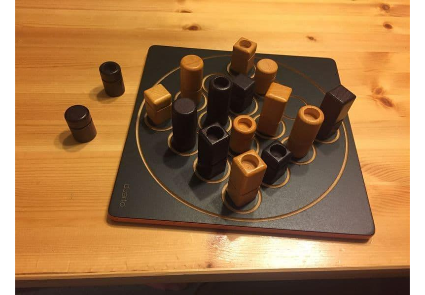 Quarto! has a 4×4 board and 16 pieces. Each piece has four dichotomous attributes – color, height, shape, and consistency – so each piece is either black or white, tall or short, square or round, and hollow or solid. The object is to place the fourth piece in a row in which all four pieces have at least one attribute in common. The twist is that your opponent gets to choose the piece you place on the board each turn.