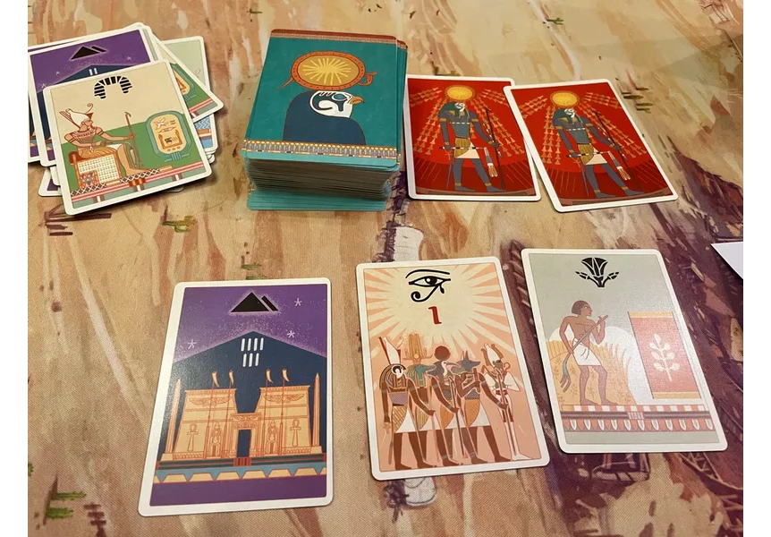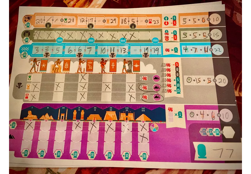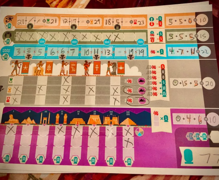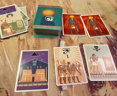 The game is played over three rounds, known as Kingdoms: The Old Kingdom, The Middle Kingdom, and The New Kingdom. Over the course of the game, players advance different aspects of their civilization by filling in spaces on their scoresheet. Each Kingdom ends immediately once three Ra cards have been revealed, then the round is scored.