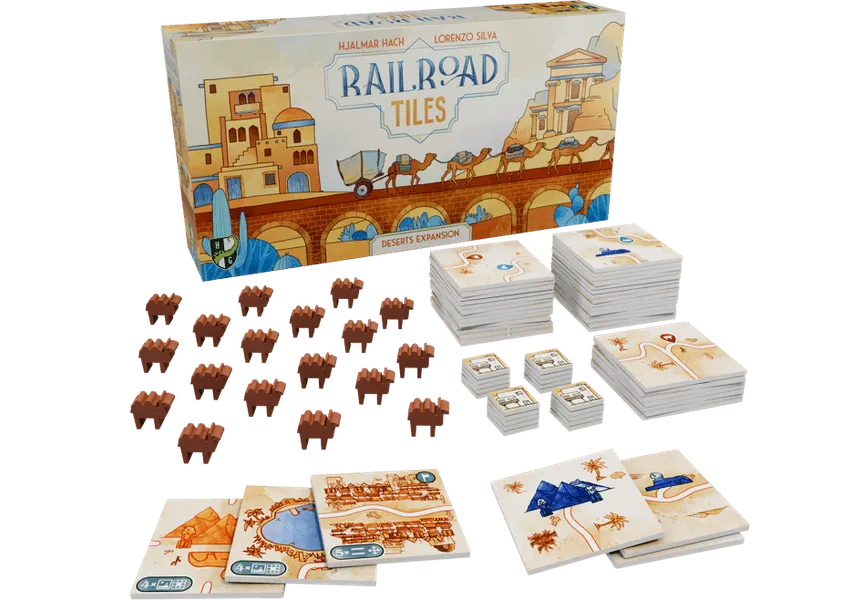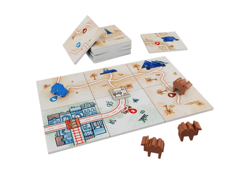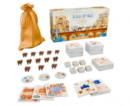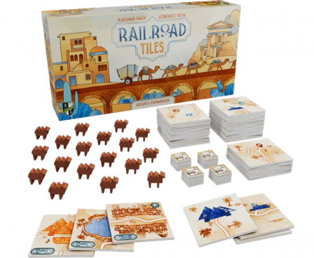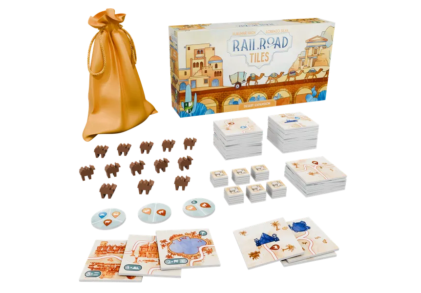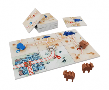 Desert tiles feature regular Car and Traveler pin points, but they lack Train pin points. In their place, they feature Camel pin points. You can use a Train Placement token to place a Camel on such a pin point, instead of placing a Train pawn. Desert tiles also feature Desert Trails: these are special routes that can be connected to both Highways and Railways: when you do, you place a Desert Station on the joining point token to mark the connection. Desert Stations are important for the scoring of both Desert Attractions and Camels.