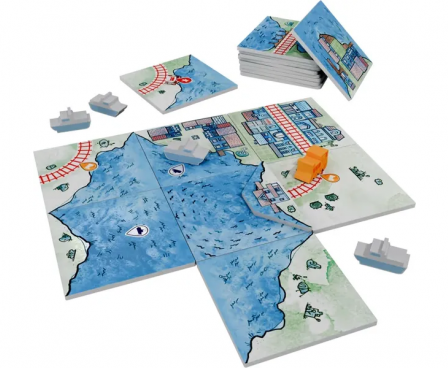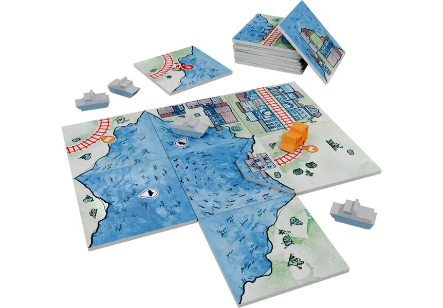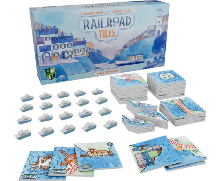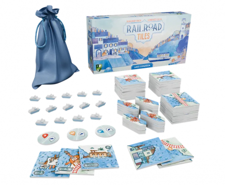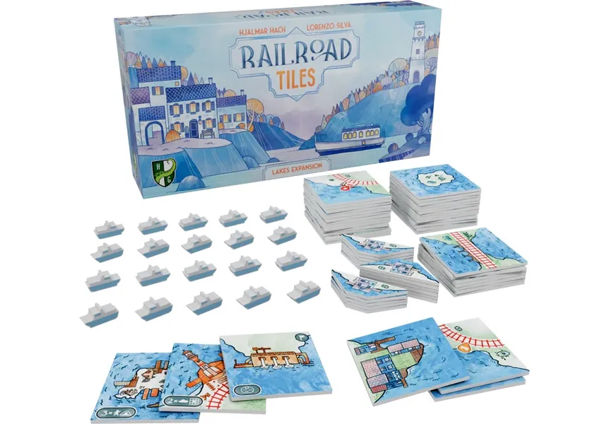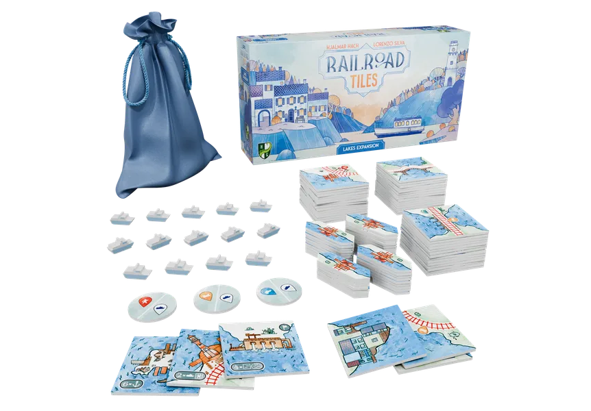 Your goal is to build Lakes and place Ferries in them to score points. Lakes also have another purpose: you can send a route into the lake side of a tile to create a Harbor (a bit like Canal End tokens work in the Canals Expansion), and all routes that are connected to the same Lake via Harbors are also connected to each other... basically, Lakes act as big Stations!