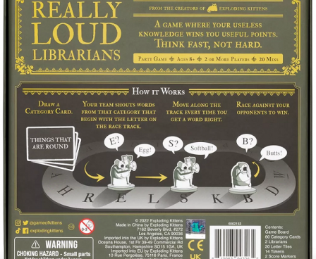 Includes 1 gameboard, 60 category cards, 2 librarians, 2 letter tiles, 14 tokens, 2 score markers, 1 chain, and 1 timer