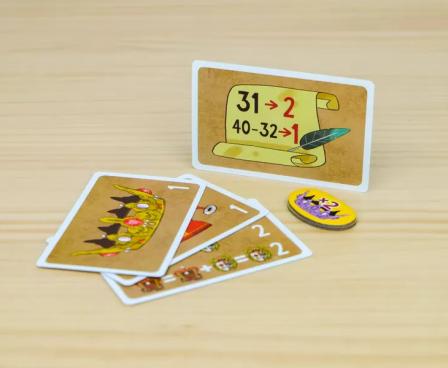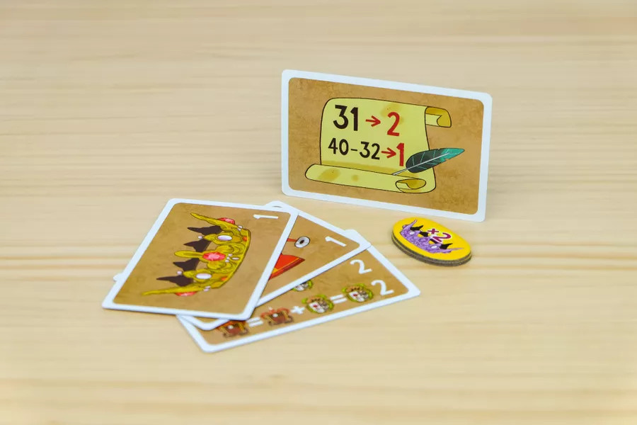 The intuitive card design makes it quick and easy to learn how they function. And if you know how to play Mus, some of the rules will seem familiar. Rounds are structured in 3 phases: hand construction in which players try to get the most favorable card combinations, a betting phase where they bid on the best hands, and point resolution. To start, put the 4 scoring cards in the middle of the table alongside the betting chits. Shuffle the remaining 40 cards, deal 4 face down to each player, and put the rest in the middle of the table. You’re now ready to start the first phase!