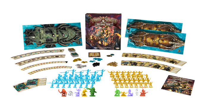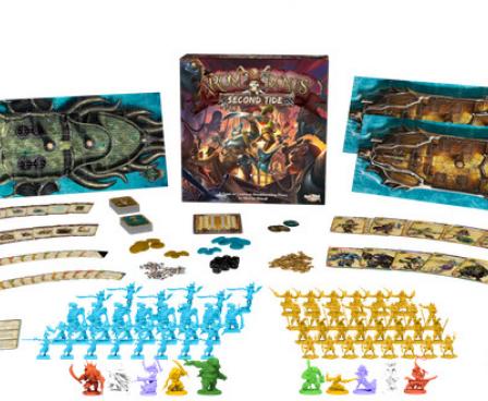 This game is both a stand-alone and compatible as an expansion to Rum & Bones. In Rum & Bones: Second Tide, 2 to 6 players will take control of one of two deadly pirate crews: The mysterious and monstrous Deep Lords, who seek to claim Davy Jones’ treasure in an effort to flood the world and reshape it to their liking, or the Marea de la Muerte¸ a crew of ruthless gold-seeking Spanish cutthroats who will stop at nothing to claim the treasure for their own greed!