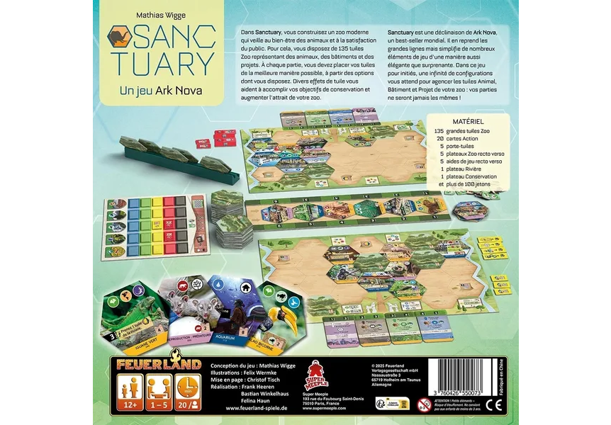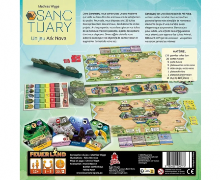 In Sanctuary, you will plan and design a modern, scientifically-managed zoo for animals and visitors. A supply of 135 unique zoo tiles provides you with animals, buildings, and projects. In every game, you want to find the best mix from those available to build the most successful zoological establishment. Different effects on the tiles will help you to achieve conservation goals and to increase the attraction of your zoo.