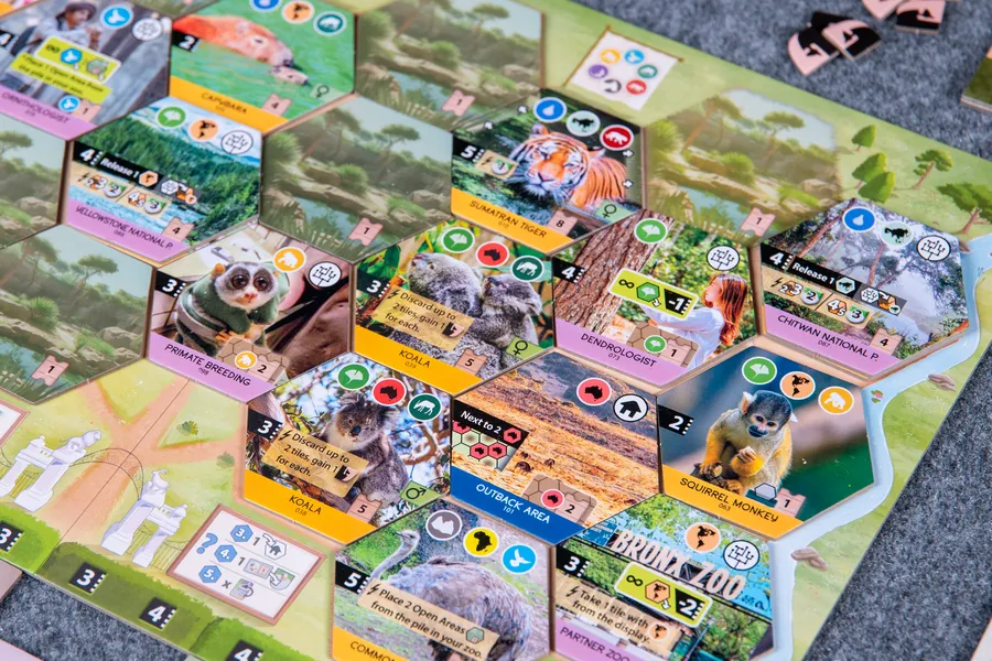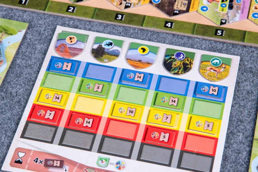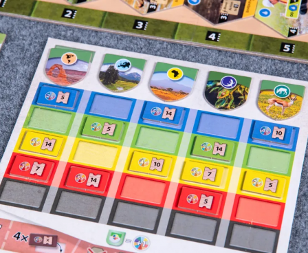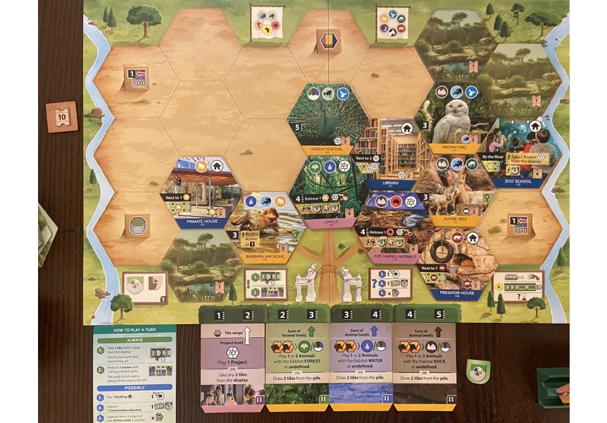 Each player has a set of four action cards to manage their gameplay, and the power of an action is determined by the slot the card currently occupies. One of those cards will let you play projects, and the other three cards will let you play animals of a specific habitat: forest, rock, or water.